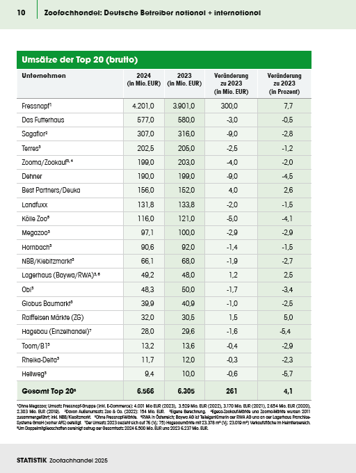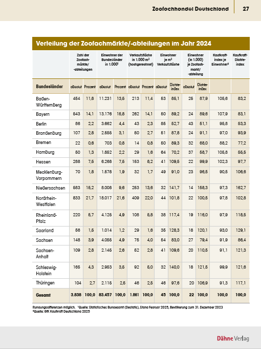 Die Statistik Zoofachhandel liefert aktuelle Zahlen, Statistiken und Analysen über den Zoofachhandel in Deutschland, Österreich, Schweiz per 31.12.2024. Die solide Datenbasis und Analysequelle für die Entscheider der Branche sowie für Unternehmensberatungen, Marktforschungsunternehmen und Verbände. Beziehbar auch im Abonnement mit 10 % Rabatt auf den jeweiligen Einzelpreis**